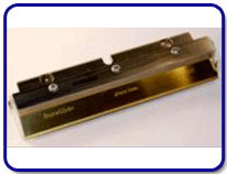 | Photo Stencil's patented DuraGlide™ metal squeegee is unique, both in its materials and design. It is manufactured according to a proprietary in-house process. First a precisely engineered edge and surface is produced , then the entire blade is coated with Titanium Nitride to provide an extremely hard surface finish. This treatment preserves the engineered edge feature throughout the life of the squeegee blade. This yields near perfect solder brick deposits over tens of thousands of print cycles.